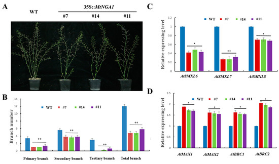 To analyze branch number, the primary, secondary and tertiary branches in plants of these lines were counted (Figure 6A,B). Under normal growth conditions, the number of primary and secondary branches in the transgenic plants was reduced by 2–3 compared with that in the WT plants, and the primary branch numbers of the MtNGA1-7 and MtNGA1-14 lines were only one. For the MtNGA1-11 lines, a minority of plants produced another weak branch from the basal rosette, but could not produce seeds. The MtNGA1-7 lines could not produce tertiary branches, while the MtNGA1-14 and MtNGA1-11 lines had 1–2 small tertiary branches, and WT plants had 3–4 tertiary branches (Figure 6B). The total branch numbers in transgenic lines were obviously also significantly lower than those in the WT plants (Figure 6B).