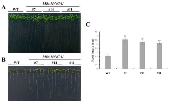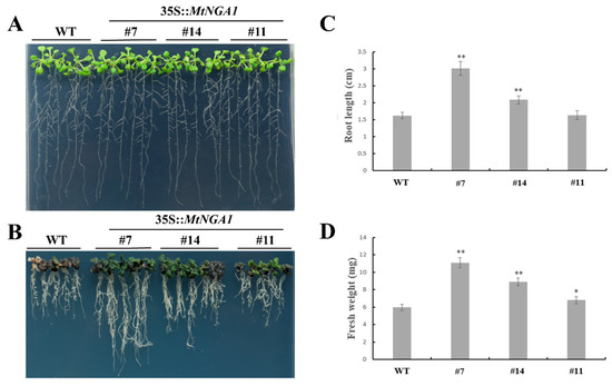 Based on the expression patterns of MtNGA1, tolerance to mannitol and NaCl was estimated in WT and transgenic Arabidopsis. On 1/2 MS medium, all transgenic lines and WT plants showed similar phenotypes (Figure 7A). When mannitol at a final concentration of 500 mM was added to the 1/2 MS medium, the wild-type seedlings gradually turned purple and yellow, and finally died, and their roots were shorter than those from the majority of the transgenic lines (Figure 7B). The average root lengths of the MtNGA1-7 and MtNGA1-14 transgenic lines were 85% and 28% longer than that of WT plants, respectively, while the differences in root length between the MtNGA1-11 transgenic lines and wild-type plants ware not significant (Figure 7C). Compared with that of the WT plants, the fresh weights of the MtNGA1-7, MtNGA1-14 and MtNGA1-11 transgenic lines were 85%, 48% and 14% higher, respectively (Figure 7D). In general, MtNGA1 transgenic plants exhibited enhanced tolerance to mannitol-induced stress compared to wild-type plants.