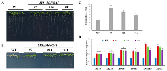 Plants are subject to many environmental stresses during their growth, and some transcription factors, enzymes, and metabolites [39] have been shown to be involved in the plant’s response to adversity. To further study the function of the MtNGA1 gene, we tested the resistance of MtNGA1 transgenic Arabidopsis to stress. The resistance of MtNGA1 transgenic Arabidopsis to mannitol-induced osmotic stress and salt stress was stronger than that of wild-type Arabidopsis. Although mannitol can enter cells and affect metabolism, its short-term use as an osmotic agent can mimic the effects of water stress [32]. Under the osmotic stress induced by mannitol, the leaves of MtNGA transgenic plants were dark green and had higher fresh weight, compared with wild Arabidopsis. This phenomenon may be due to the transgenic plants under stress maintaining a higher chlorophyll content, and thus maintaining a higher photosynthetic efficiency. Under water stress conditions, chlorophyll biosynthetic intermediate accumulation in plant leaf cells is reduced, affecting the chlorophyll synthesis pathway, and the accumulation of reactive oxygen species accelerates the degradation of chlorophyll, resulting in a decline in chlorophyll accumulation and blocking of the photosynthetic energy conversion system. This eventually reduces the photosynthetic efficiency, affecting plant growth [40,41,42] (Figure 7B). Furthermore, we examined the expression levels of the genes AtPLC1, AtPLC3, AtPLC4, AtPLC5, AtNCED3 and AtDI21 in transgenic MtNGA1 plants under normal conditions. The AtPLC genes are induced by various environmental stimuli, including cold, salt and dehydration, and transcriptional activation of the AtPLC genes is crucial to the adaptation of plants to environments of stress [43,44]. NCED3 and AtDI21 are involved in ABA-dependent regulation of stress-related pathway [45]. NINE-CIS-EPOXYCAROTENOID DIOXYGENASE 3 (NCED3) is an important enzyme in the ABA biosynthetic pathway and ABA accumulation during drought stress [46]. NCED3 knockout mutants under drought stress conditions exhibited decreased ABA accumulation and drought stress-sensitive phenotypes [47]. In our study, the expression levels of AtPLC1, AtPLC3, AtPLC4, AtPLC5, AtNCED3 and AtDI21 were upregulated in MtNGA1 transgenic plants compared to WT plants. These results suggested that MtNGA1 induced the expression of AtPLC1, AtPLC3, AtPLC4, AtPLC5, AtNCED3 and AtDI21. A previous study also demonstrated that AtNGA1 activated the NCED3 gene by binding to the NGA-binding element (NBE) cis-acting sequence in the promoter of the NCED3 gene during dehydration stress [25]. Therefore, MtNGA1 may be involved in regulation of the stress-response pathway.