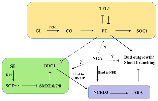 Proposed role of NGA in regulating bud outgrowth/shoot branching in monocotyledons and dicotyledons. GI, GIGANTEA. CO, CONSTANS. FT, Flowering locus T. SOC1, SUPPRESSOR OF OVEREXPRESSION OF CONSTANS 1. TFL1, TERMINAL FLOWER 1. FKF1, FLAVIN-BINDING, KELCH REPEAT, F-BOX 1. SL, Strigolactone. D14, DWARF14. SCFMAX2, SCFMAX2 complex. SMXL, SMAX1-LIKE6. MAX, MORE AXILLARY GROWTH. BRC, BRANCHED. NBE, NGA-binding element. NCED3, NINE-CIS-EPOXYCAROTENOID DIOXYGENASE. ABA, abscisic acid. HD-ZIP, Homeodomain-leucine zipper.