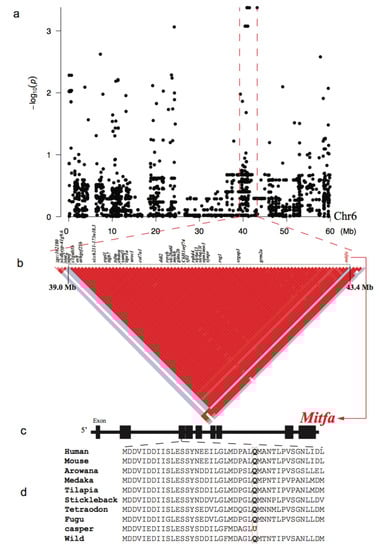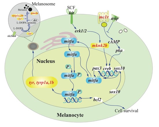 - Lister, J.A.; Close, J.; Raible, D.W. Duplicate mitf genes in zebrafish: Complementary expression and conservation of melanogenic potential. Dev. Biol. 2001, 237, 333–344. [Google Scholar] [CrossRef]