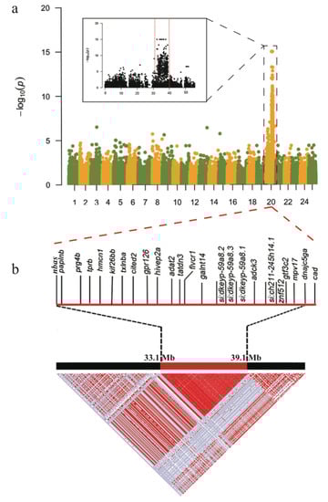 - Barrett, J.C.; Fry, B.; Maller, J.; Daly, M.J. Haploview: Analysis and visualization of LD and haplotype maps. Bioinformatics 2005, 21, 263–265. [Google Scholar] [CrossRef] [PubMed]