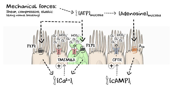 The first detailed characterisation of a CaCC in a secretory epithelium [57] described a conductance that was both voltage- and calcium-dependent and was proposed as the major chloride conductive pathway in the apical membrane of rat lacrimal glands following muscarinic stimulation. In the human airway, calcium ionophores and purinergic agonists were demonstrated to likewise stimulate a calcium-dependent secretory current in both normal and CF derived cells [58,59,60] and also to elicit a hyperpolarisation of the nasal potential difference (NPD) when perfused over the nasal mucosa of CF patients [61]. The endogenous production and release of purinergic ligands, particularly ATP and UTP, in the airway mucosa appears to be central to the regulation TMEM16A function [48,62,63]. Mechanical forces established during normal breathing (compressive, elastic and shear) have been demonstrated to increase levels of purinergic ligands in the airway-lining fluid and in turn regulate ion transport processes and promote fluid secretion (Figure 2). As described above, these effects are not exclusively TMEM16A-mediated, as elevated intracellular calcium will also influence CFTR and ENaC function (Figure 1), and the metabolism of ATP to adenosine in the airway mucosa will activate CFTR through an adenosine A2b-receptor/cAMP/PKA-dependent mechanism [64,65]. Such a regulatory mechanism provides the signalling to ensure that any increase in evaporative fluid loss as either the rate or depth of breathing changes can be compensated for by increasing fluid secretion and that any increased burden of airway mucus is likewise provided with the necessary hydration. Of note, exercise and chest physiotherapy both improve clinical outcomes in CF and will also enhance calcium-mediated fluid secretory mechanisms and promote mucus clearance [63,66,67]. These data support the concept that TMEM16A can provide a meaningful level of anion and therefore fluid transport into the airways of CF patients, and although it is likely sufficient to maintain a basal level of mucus clearance, it can be overwhelmed in the absence of concomitant CFTR function. For example, during viral infections it has been demonstrated that levels of airway ATP can be reduced through accelerated metabolism resulting in attenuated TMEM16A-mediated fluid secretion with implications for mucus clearance [62].