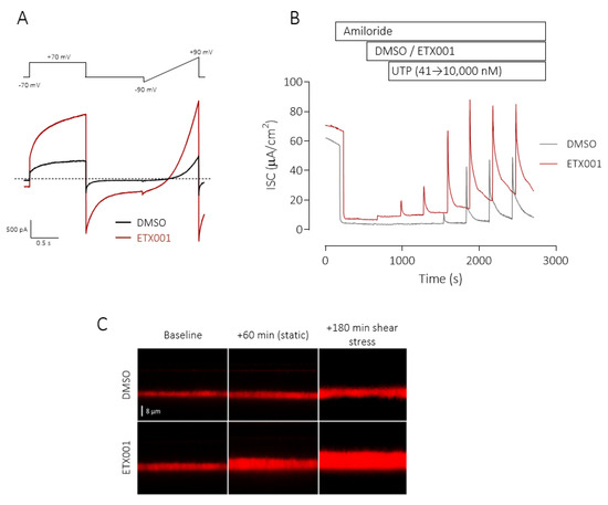 ETX001 potentiates TMEM16A function in recombinant and primary human cell systems. Whole-cell patch-clamp electrophysiological recordings from FRT cells stably expressing hTMEM16A (A) in the absence (black lines) and presence (red lines) of ETX001 (1.1 µM). Dotted line indicates the zero-current level. Sample raw data trace illustrating the effects of ETX001 (1 µM) upon the UTP-stimulated anion current response (B). After inhibition of the ENaC current with amiloride (10 µM), inserts were treated with either DMSO (grey dotted trace) or 1 µM ETX001 (red line) prior to the cumulative addition of increasing concentrations of UTP. (C) Sample XZ confocal images of airway surface liquid (ASL) visualised using Texas red staining in the absence and presence of ETX001 (1 µM). The change in ASL height from baseline was measured following a 1 h treatment with ETX001 or vehicle under “static conditions”, i.e., no shear stress, and also after 3 h of continual shear-stress. Reprinted from [39] with permission of the American Thoracic Society. Copyright © 2020 American Thoracic Society. The American Journal of Respiratory and Critical Care Medicine is an official journal of the American Thoracic Society.