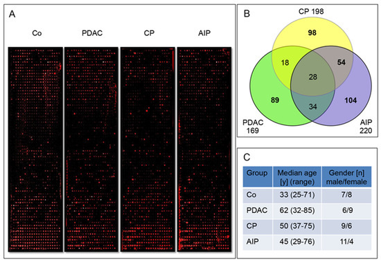 (A) Example of four microarrays equally spotted with 1600 human recombinant proteins each after incubation with enriched IgG serum fractions from healthy Co, PDAC, CP and AIP. Red dots indicate specific autoantigen/autoantibody complex formation and colour intensity represents the amount of the specific autoantibody bound. White dots indicate saturated signals with maximal intensity. For technical reasons, background signals were higher at the top and bottom end of the arrays. Still, the selection criteria permitted identification of real positive signals. (B) Number of autoantigens retrieved from the first sample set. The profiling allowed discrimination between disease-specific and disease-overlapping autoantibodies for PDAC, CP, and AIP. (C) Sample set 1 patients’ data was composed of 60 serum samples assembled in four groups.