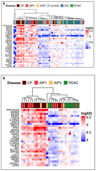 Overview of pooled serum antibody reactivity to the selected autoantigens. AIP-1, AIP-2 and CP mostly show higher autoantibody reactivity than PDAC and, thus, help to differentiate PDAC from primarily inflammatory pancreatic diseases. Heatmaps generated from intermediate-sized protein microarrays data presenting serum antibodies reactivity with the indicated antigens in the six tested cohorts. High autoantibody reactivity values are presented by red, low autoantibody reactivity by blue boxes. Data are presented as differential median fluorescence intensity MFI (MFI log2 scale) levels of the response to the 29 autoantigens. (A) For comparison of all cohorts the following pools were used: Co (n = 14); PDAC (n = 8); CP (n = 7); GID (n = 10); AIP-1 (n = 10), and AIP-2 (n = 3). (B) Hierarchical clustering using the log2 MFI of the 29 autoantigens between the three different pancreatic diseases and visualization of higher reactivity of CP- and both AIP subtypes-serum antibodies versus PDAC-serum antibodies.