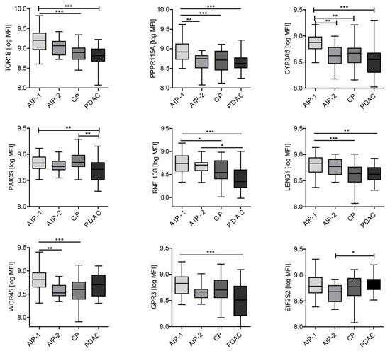 Nine of them revealed significantly higher median MFI in AIP than in PDAC sera. Surprisingly CA-II, representing a well-known autoantigen in AIP (p = 0.0173), was recognised significantly more in PDAC compared to AIP sera. Subsequently, all antigens were separately compared among all groups of patients’ sera. The selected candidates with corresponding median MFI and p values and for each disease group that were significantly different among the disease groups are presented in Supplementary Table S2.