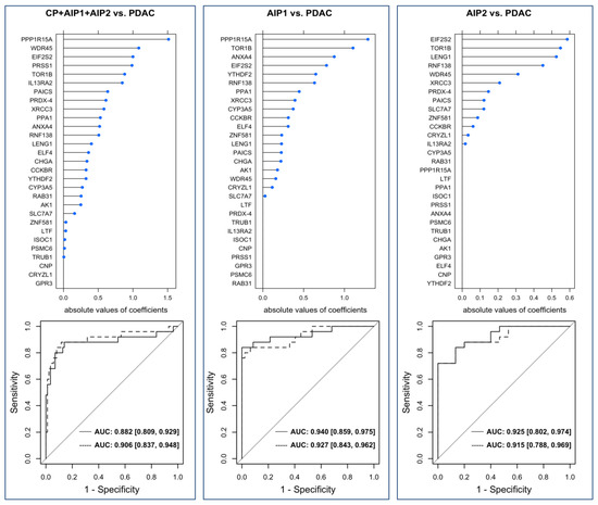 The predictive performance of the models. Upper graphs present the variable importance measured as mean absolute values of the coefficients estimated during cross-validation of the models incorporating the 29 identified antigens. Below, corresponding ROC curves of the statistical models discriminating between AIP-1+AIP-2+CP vs. PDAC (left), AIP-1 vs. PDAC (middle), and AIP-2 vs. PDAC (right). The ROC curves for the models based on the 29 antigens are depicted as continuous lines and the ROC curves for the models based on the 36 antigens as dashed lines. The corresponding confidence intervals of the AUC values are indicated in the square brackets. Confidence intervals for the AUC values were computed by the formula according to Wilson [19].