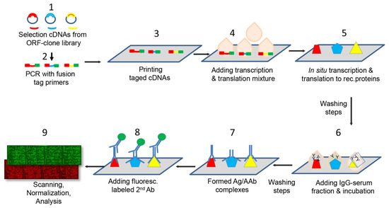 Simplified flow chart of the nine major steps for the manufacture of protein microarrays and their application for autoantibody detection and profiling. 1: cDNAs selection from library 2: Two-step PCR for enrichment cDNAs and fusion with tag primers. 3: Spotting of cDNAs on the epoxisilane-coated slides. 4: Addition of expression mixture to each DNA spot. 5: Incubation of the DNA/expression mixture for cell free transcription and translation. Removal of unbound proteins by washing. The recombinant proteins were retained through an epoxy-amino reaction. 6: Addition of IgG serum fractions and formation of antigen/antibody complexes. 7: Removal of unbound IgGs. 8: Incubation with fluorescence-conjugated secondary antibodies (anti-human IgG, IgM and IgA) directed against the primary antibodies from the patient sera. 9: Scanning of microarrays using a 635 nm laser (assessment of fluorescence intensity of each spot and normalization and microarray data analysis.