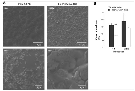 Morphologic and mechanical characterization of polymer materials used in this study. (A) SEM images of PMMA-BPO and 4-META/MMA-TBB materials 24 h after mixing polymer and monomer. (B) Vickers hardness of the two materials 1 and 24 h after mixing. *** p < 0.001, statistically significant difference between the two materials. PMMA-BPO, poly(methyl methacrylate)–benzoyl peroxide; 4-META, 4-methacryloyloxylethyl trimellitate anhydride; MMA-TBB, methyl methacrylate–tri-n-butyl borane.