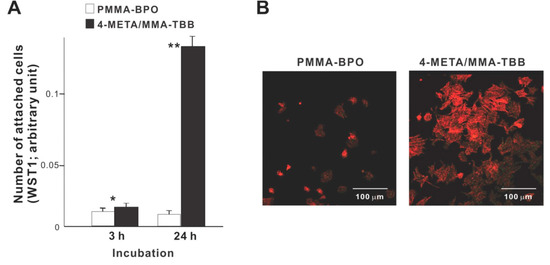 We here devised two strategies to improve PMMA-based bone cement: (1) adding hydrophilicity to bone cement to increase cellular affinity; and (2) using a different type of polymerization initiator to minimize free radical production. With respect to hydrophilicity, there is evidence that hydrophilic titanium surfaces attract osteoblasts and promote subsequent osteogenesis [26,27,28,29,30,31]. To make PMMA more hydrophilic, here we added 4-methacryloyloxylethyl trimellitate anhydride (4-META) to the MMA monomer, since 1%–5% 4-META added to conventional acrylic resin is known to form hydrophilic methacrylate [32,33,34]. With respect to minimizing free radical production, we tested tri-n-butyl borane (TBB) as a polymerization initiator. TBB better promotes polymerization than BPO, leaving less residual monomer [35] while suppressing the production of free radicals [36]. In addition, TBB-initiated polymerization generates less heat than BPO [37]. Further, unlike BPO, TBB is moisture resistant, and the addition of TBB may help promote polymerization under wet conditions [34,38], a valuable property for bone cement used in bone marrow cavities. Given these strategies and supporting rationale, the objective of this study was to compare the biological capability and osteoconductivity of PMMA-BPO, common bone cement ingredients, and 4-META/MMA-TBB, newly formulated ingredients. To gain an understanding of the underlying mechanisms, the physicochemical properties of these materials, i.e., time-dependent changes in hydrophobic/hydrophilic properties and the production of polymerization radicals were also studied.