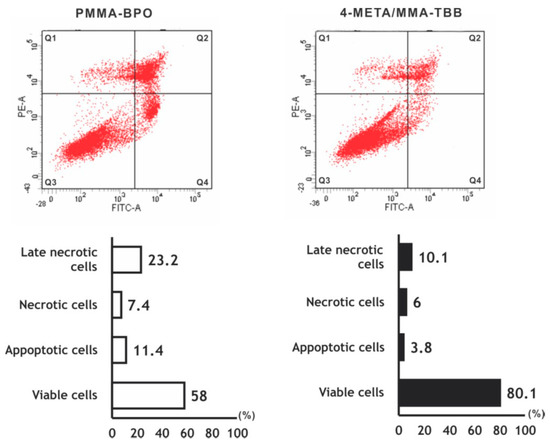 The number of viable osteoblasts on 4-META/MMA-TBB after 24 h was higher than that on PMMA-BPO (Figure 3), with 80.1% on 4-META/MMA-TBB and 58.0% on PMMA-BPO. The percentage of apoptotic cells and late necrotic cells was lower on 4-META/MMA-TBB cement.