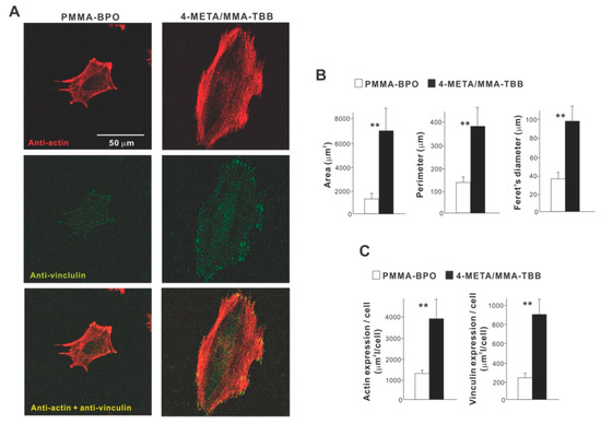 High magnification confocal microscopy at 24 h showed that osteoblasts on 4-META/MMA-TBB were generally spread larger and had more intensive localization of cytoskeletal actin along the cellular outline, suggestive of advanced lamellipodia-like cytoplasmic projection development (Figure 4A). Additionally, the expression of a focal adhesion protein, vinculin, appeared denser and more extensive in osteoblasts seeded on 4-META/MMA-TBB cement. Cytomorphometric (Figure 4B) and densitometric (Figure 4C) evaluations confirmed these qualitative observations.