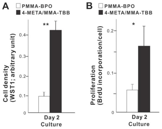 We next examined how osteoblast proliferation and function are affected by the two different materials. The number of propagated osteoblasts on day 2 of culture was significantly greater on 4-META/MMA-TBB than on PMMA-BPO (Figure 5A). Similarly, the proliferative activity as measured by BrdU incorporation into DNA was higher on 4-META/MMA-TBB (Figure 5B).