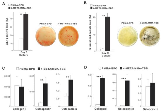 The expression of osteogenic genes was evaluated on days 3 and 10. Osteopontin and osteocalcin expression was upregulated on 4-META/MMA-TBB on day 3 compared to PMMA-BPO, while the expression of type 1 collagen was similar between the two materials (Figure 6C). On day 10, the expression of type 1 collagen and osteopontin was significantly upregulated on 4-META/MMA-TBB cement (Figure 6D).