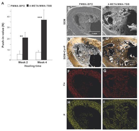 The strength of bone-cement integration as evaluated by the biomechanical push-in test at week 2 of healing was 4-times greater for 4-META/MMA-TBB than for PMMA-BPO (Figure 7A). The difference was even greater (5-times) at week 4. The push-in value significantly increased between 2 and 4 weeks for 4-META/MMA-TBB but not for PMMA-BPO.