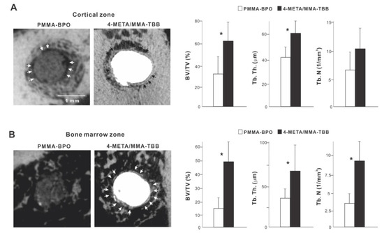 In the bone marrow zone, bone formation around PMMA-BPO implants/cement appeared limited, scattered, and distant from the cement surface (Figure 8B). In contrast, bone formation around 4-META/MMA-TBB implants/cement was robust, contiguous, and juxtaposed with the cement surface (white arrowheads). BT/TV, trabecular thickness, and trabeculae number were significantly higher around 4-META/MMA-TBB implant/cement than PMMA-BPO implant/cement (Figure 8B).