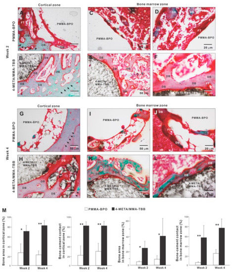 Histomorphometric analyses demonstrated that bone volume was remarkably greater in the 4-META/MMA-TBB group than the PMMA-BPO group both in the cortical and bone marrow zones at weeks 2 and 4 (Figure 9M). Likewise, the percentage of bone-cement contact in the cortical and bone marrow zones was much greater in the 4-META/MMA-TBB group, supporting the microscopic findings.