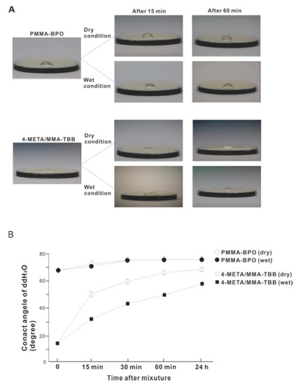 The contact angle of 10 μL of ddH2O placed on the surface of 4-META/MMA-TBB immediately after mixing was 14.5°, which is considered hydrophilic (contact angle <60°) (Figure 10A,B). The 4-META/MMA-TBB surface remained hydrophilic until 15 min after mixing under dry conditions. In contrast, the contact angle of ddH2O on PMMA-BPO was greater than 65° immediately after mixing and was considered hydrophobic. The contact angle increased to greater than 70° 15 min after mixing under dry conditions and stayed hydrophobic up to 24 h after mixing. The contact angle on the 4-META/MMA-TBB surface remained below 60° for up to 1 h under wet conditions and remained hydrophilic. The sustained hydrophilicity under wet conditions was not observed for PMMA-BPO, which remained hydrophobic regardless of condition and time observed.
