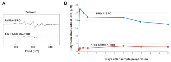 ESR analysis revealed that free radical production rapidly increased immediately after mixing within 1 h inside PMMA-BPO, and that the production remained high throughout and up to 10 days, even though production decreased slightly over time (Figure 11A,B). On 10 days, free radical production remained approximately 80% of its peak. Free radical production within 4-META/MMA-TBB also increased within 1 h but remained very low throughout and up to 10 days, in marked contrast to PMMA-BPO. The free radical level for 4-META/MMA-TBB was approximately 1/25th that seen for PMMA-BPO 1 h post-mixing, 1/10th that of PMMA-BPO 1-day post-mixing, and 1/6th that of PMMA-BPO 10-days post-mixing.