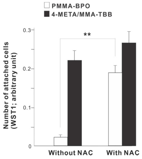 To determine the role of free radical production on biocompatibility of the resin materials, we prepared the experimental N-acetyl cysteine (NAC)-added materials. The free radical-scavenging function of NAC has been reported extensively [23,67,68,69,70]. NAC was prepared as 1M stock solution in HEPES buffer whose pH was adjusted to 7.2. The NAC solution was mixed with MMA liquid before mixing with PMMA powder to make a final concentration of 5 mM.