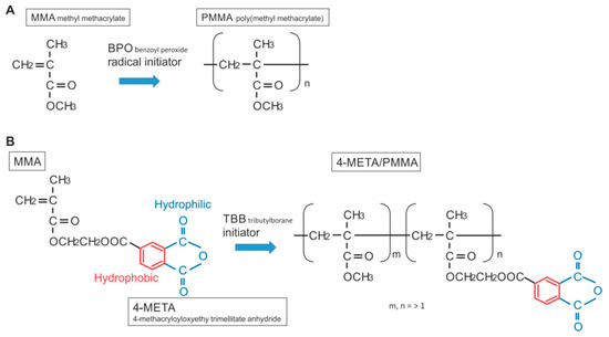 Structure and chemical formula during polymerization of PMMA-BPO and 4-META/MMA-TBB materials used in this study.