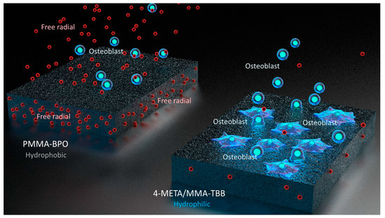 Schematic diagram of unique physicochemical property of 4-META/MMA-TBB characterized by a hydrophilic surface and minimal free radical production during polymerization, which enhances osteoblastic attachment and subsequent osteogenic function.