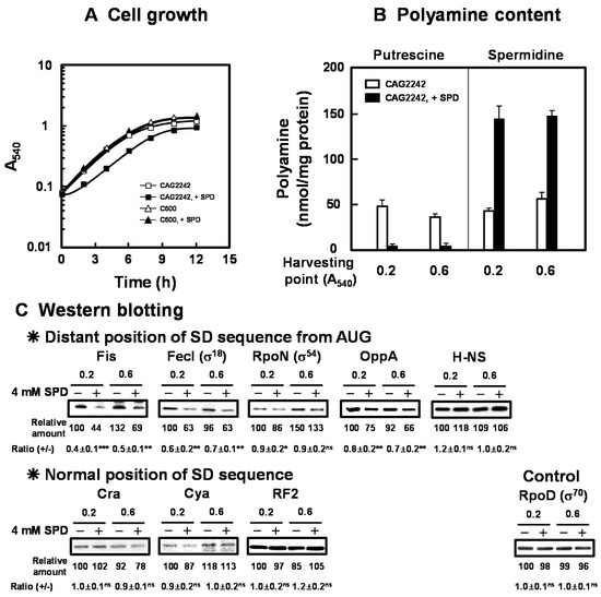 As shown in Figure 2A, the reduction of growth rate of E. coli CAG2242 by 4 mM SPD was not altered at 42 °C compared to 37 °C. However, the lag phase of growth of E. coli CAG2242 in the presence of 4 mM SPD at 42 °C was prolonged, and the yield was less at 12 h. Therefore, growth of E. coli CAG2242 in the presence of 4 mM SPD at 42 °C was slightly slower than at 37 °C. These results indicate that cell toxicity caused by excess SPD was slightly increased at the elevated temperature. The synthesis of the proteins essential for cell growth under heat shock conditions [RpoE (σ24), StpA] encoded by members of polyamine modulon that have the position of the SD sequence distant from initiation codon AUG in their mRNAs was slightly but significantly inhibited by excess SPD (Figure 2B).