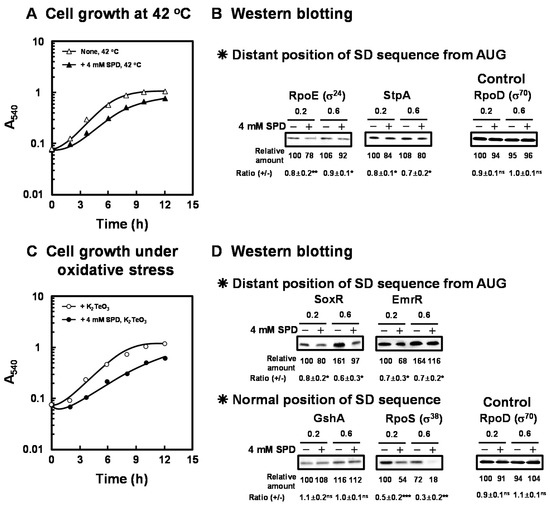 Inhibition of cell growth of E. coli CAG2242 by excess SPD under heat shock stress and oxidative stress conditions. E. coli CAG2242 cells were cultured as described in the legend of Figure 1 at 42 °C (A) and in the presence of 0.6 µM K2TeO3 (C) with or without 4 mM SPD. Values are means of triplicate determinations. Error bars are within the symbol size. The levels of RpoE (σ24), StpA, SoxR, EmrR, and GshA were measured together with a control protein, RpoD (σ70), by Western blotting (B,D). Values are means ± S.E. of triplicate determinations. Student’s t-test was performed for the values obtained in the presence of SPD versus in the absence of SPD. ns, p ≥ 0.05; *, p < 0.05; **, p < 0.01; ***, p < 0.001.