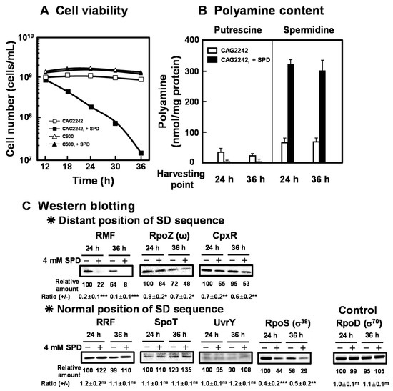 Inhibition of cell viability of E. coli CAG2242 by excess SPD. E. coli CAG2242 cells were cultured as described in the legend of Figure 1. Cell viability was determined by counting colony numbers in aliquots of the culture grown on LB-containing 1.5% agar plates at 37 °C. Values are means of triplicate determinations. Error bars are within the symbol size (A). Polyamine contents in the cells harvested at A540 of 24 h and 36 h were measured as described under “Materials and Methods” (B). The levels of RMF, RpoZ (ω), CpxR, RRF, SpoT, UvrY, and RpoS (σ38) were measured together with a control protein, RpoD (σ70), by Western blotting (C). Values are means ± S.E. of triplicate determinations. Student’s t-test was performed for the values obtained in the presence of SPD versus in the absence of SPD. ns, p ≥ 0.05; *, p < 0.05; **, p < 0.01; ***, p < 0.001.