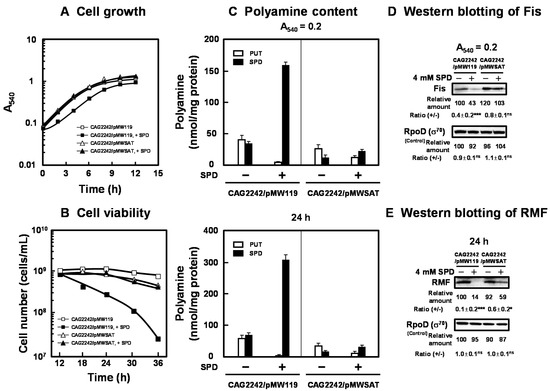 The effect of SPD acetyltransferase on cell growth and viability was assessed. As shown in Figure 4A,B, the transformant of E. coli CAG2242 with pMWSAT encoding the gene for SPD acetyltransferase recovered cell growth and viability in the presence of excess SPD. Polyamine contents in the cells grown with or without SPD were then measured at the logarithmic and stationary phases (Figure 4C). The level of SPD in cells was markedly decreased when pMWSAT was transformed. We previously reported that cell growth and viability of E. coli MA261, a polyamine-requiring mutant, was reduced by depletion of polyamines. Under the depletion of polyamines, the transformant of E. coli MA261 with fis and rmf genes with modifications in the position of the SD sequence to the normal position recovered cell growth and viability [20,25]. Thus, the synthesis of Fis, a global regulator of transcription of some growth-related genes, including genes for rRNA and tRNA, was examined at the logarithmic phase, since Fis is an essential protein for cell growth. In addition, the synthesis of RMF was examined at the stationary phase, since RMF is an important protein for cell viability. With pMWSAT, Fis and RMF were synthesized efficiently even in the presence of SPD (Figure 4D). By the addition of excess SPD, cell growth and viability were enhanced in parallel with the increase in the levels of Fis and RMF (Figure 4A). These results indicate that cell growth and viability are reduced by excess polyamines through translational repression of the specific proteins encoded by polyamine modulon whose SD sequence in the mRNA is located distant from initiation codon AUG.