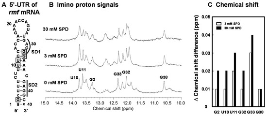 We have previously shown that the structural change of the bulged-out region of the double-stranded RNA induced by SPD is strongly involved in polyamine stimulation of specific protein syntheses [23]. In order to elucidate a cytotoxic mechanism resulting from excessive accumulation of SPD in detail, the structural change of the initiation region of the rmf mRNA (RMF-WT RNA) by SPD was evaluated by NMR analysis. In Figure 5A, the predicted secondary structure (43-mer nucleotides) of the initiation region of the rmf mRNA was constructed based on the predicted secondary structure of the region by vsfold [37]. The 1D imino proton spectrum of the RMF-WT RNA showed that the overall secondary structure was not changed, but local structures were affected by addition of 3 mM or 30 mM SPD (Figure 5B). The chemical shift change of assigned imino proton signals for G2, U10, U11, G32, G33, and G38 by the addition of SPD are shown in Figure 5C. In general, the chemical shift changes induced by 30 mM SPD were greater than those induced by 3 mM SPD indicating that more SPD molecules bind to the RNA in the presence of excess amount of SPD. This result suggests that the structure including the bulged-out region in the mRNA became more structured in the presence of excess SPD, so that the SD sequence of the rmf mRNA cannot approach initiation codon AUG.
