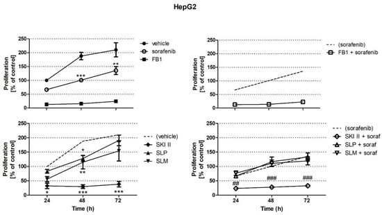 Since the sphingolipid pathway has already been shown to affect HCC pathophysiology [], we assumed that the stimulation of HCC cell lines with inhibitors of the sphingolipid pathway may regulate HCC proliferation in vitro. In the current study, the ceramide synthase inhibitor FB1, the specific SPHK1 inhibitor SLP7111228, the specific SPHK2 inhibitor SLM6031434, and SKI II, an inhibitor of both SPHKs, were used. There are several studies that have demonstrated that S1P is probably promoting the invasiveness and metastasis of HCC via the action of mainly SPHK1 [,]. Furthermore, various studies have shown that an additional inhibition of SPHKs can support sorafenib treatment. This could be shown not only in HCC cell lines [], but also in cholangiocell carcinoma cell lines [], pancreatic adenocarcinoma (Bxpc-3), and renal carcinoma (A-498) cells [].
