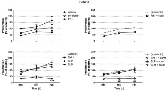 Influence of sorafenib, FB1, and SPHK inhibitors on the proliferation of Huh7.5 cells. Cell proliferation was analyzed by measuring the incorporation of radioactively labeled thymidine. The cells were pretreated with 25 µM FB1 for 1 h, or with 10 µM SKI II, 1 µM SLP, or 1 µM SLM for 2 h. Then, vehicle (control; 0.2 % DMSO) or 5 µM sorafenib (soraf) were added for the indicated periods of time. All data are derived from three independent experiments performed in triplicate, which comprised all conditions; FB1 was included in two of these experiments. The dashed lines repeatedly indicate vehicle control or sorafenib as shown in the upper left panel. The values are means ± SEM and expressed relative to vehicle control at 24 h. *** p < 0.001 compared to control; ## p < 0.01 compared to sorafenib in Two-way ANOVA.