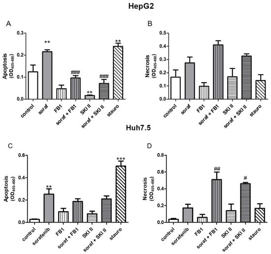 Influence of sorafenib, FB1, and SKI II on the apoptosis and necrosis of HepG2 and Huh7.5 cells. Apoptosis and necrosis were analyzed by measuring DNA fragmentation of the cytoplasmic fraction or in the supernatant. The cells (HepG2 in (A) and (B) and Huh 7.5 in (C) and (D)) were pretreated with 25 µM FB1 for 1 h, or with 10 µM SKI II for 2 h. Then, vehicle (control; 0.2% DMSO) or 5 µM sorafenib (soraf) were added for the indicated periods of time. Staurosporine (stauro) was used as a positive control. All data are derived from three independent experiments performed in triplicate. The values are means ± SEM and expressed relative to vehicle control at 24 h. ** p < 0.01, *** p < 0.001 compared to control; # p < 0.05, ## p < 0.01, ### p < 0.001 compared to sorafenib in a one-way analysis of variance with subsequent Bonferroni test. (n = 3 for all conditions).