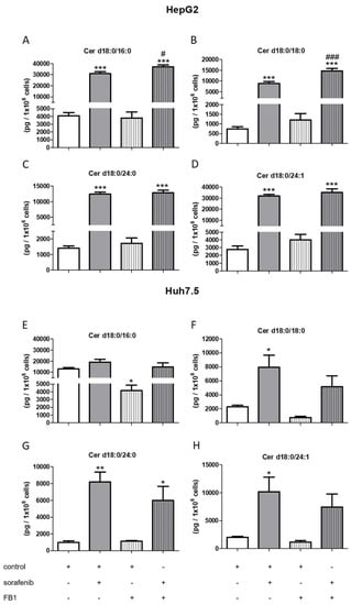 Influence of sorafenib and FB1 on concentrations of dihydroceramides in HepG2 and Huh7.5 cells. The lipids were measured by LC-MS/MS. The cells (HepG2 in (A)–(D) and Huh7.5 in (E)–(H)) were treated with or without 25 µM FB1 for 1 h before addition of vehicle (control; 0.2% DMSO) or 5 µM sorafenib and further incubation for 24 h. All results are presented as the means ± SEM of 3–6 independent experiments. * p < 0.05, ** p < 0.01, *** p < 0.001 compared to control; # p < 0.05, ## p < 0.01, ### p < 0.001 compared to sorafenib in one-way ANOVA followed by Bonferroni post-tests.