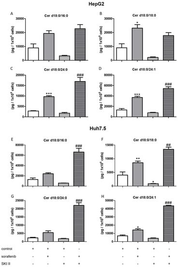 Influence of sorafenib and SKI II inhibitors on concentrations of dihydroceramides in HepG2 and Huh7.5 cells. The lipids were measured by LC-MS/MS. The cells (HepG2 in (A)–(D) and Huh7.5 in (E)–(H)) were treated with or without 10 µM SKI II for 2 h before the addition of vehicle (control; 0.2% DMSO) or 5 µM sorafenib and further incubation for 24 h. All results are presented as means ± SEM of three independent experiments. * p < 0.05, ** p < 0.01, *** p < 0.001 compared to control; ## p < 0.01, ### p < 0.001 compared to sorafenib in one-way ANOVA followed by Bonferroni post-tests.