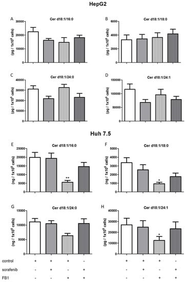 Influence of sorafenib and FB1 on concentrations of d18:1 ceramides in HepG2 and Huh7.5 cells. The lipids were measured by LC-MS/MS. The cells (HepG2 in (A)–(D) and Huh7.5 in (E)–(H)) were treated with or without 25 µM FB1 for 1 h before the addition of vehicle (control; 0.2% DMSO) or 5 µM sorafenib and further incubation for 24 h. All results are presented as means ± SEM of 3–6 independent experiments. * p < 0.05, ** p < 0.01 compared to control in one-way ANOVA followed by Bonferroni post-tests.