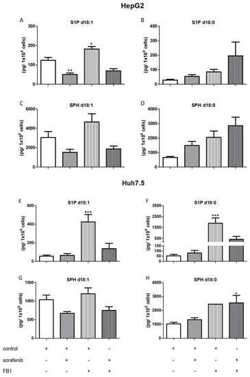 Influence of sorafenib and FB1 on concentrations of S1P and sphingosine in HepG2 and Huh7.5 cells. The lipids were measured by LC-MS/MS. The cells (HepG2 in (A)–(D) and Huh7.5 in (E)–(H)) were treated with or without 10 µM SKI II for 2 h before the addition of vehicle (control; 0.2% DMSO) or 5 µM sorafenib and further incubation for 24 h. All results are presented as means ± SEM of three independent experiments. * p < 0.05, ** p < 0.01, *** p< 0.001 compared to control in one-way ANOVA followed by Bonferroni post-tests. For SPH d18:0 in Huh7.5 cells treated with FB1, only one experiment could be evaluated.