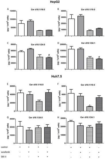 Influence of sorafenib and SKI II on concentrations of d18:1 ceramides in HepG2 and Huh7.5 cells. The lipids were measured by LC-MS/MS. The cells (HepG2 in (A)–(D) and Huh7.5 in (E)–(H)) were treated with or without 25 µM FB1 for 1 h before the addition of vehicle (control; 0.2% DMSO) or 5 µM sorafenib and further incubation for 24 h. All results are presented as means ± SEM of 3–6 independent experiments. * p < 0.05 compared to control; # p < 0.05 compared to sorafenib in one-way ANOVA followed by Bonferroni post-tests.