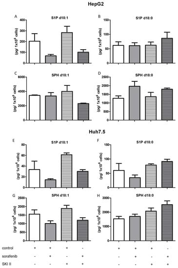 Influence of sorafenib and SKI II on concentrations of S1P and sphingosine in HepG2 and Huh7.5 cells. The lipids were measured by LC-MS/MS. The cells (HepG2 in (A)–(D) and Huh7.5 in (E)–(H)) were treated with or without 10 µM SKI II for 2 h before the addition of vehicle (control; 0.2% DMSO) or 5 µM sorafenib and further incubation for 24 h. All results are presented as means ± SEM of three independent experiments.