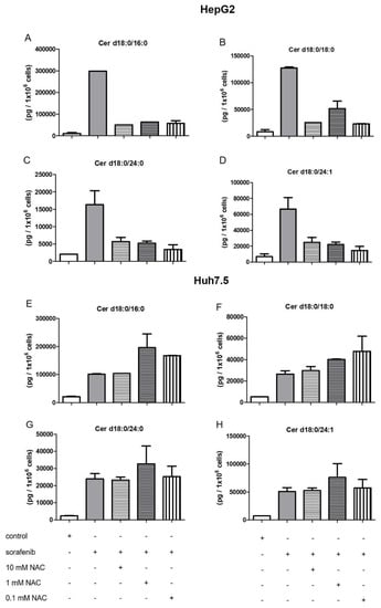 Influence of N-acetyl-cysteine (NAC) on sorafenib-mediated dihydroceramide accumulation of HepG2 and Huh7.5 cells. The lipids were measured by LC-MS/MS. The cells (HepG2 in (A)–(D) and Huh7.5 in (E)–(H)) were treated with 10 mM, 1 mM, or 0.1 mM of NAC for 1 h. Data are derived from 1–2 independent experiments performed in triplicate. For d18:0/16:0 in HepG2 cells treated with sorafenib, 10 mM + sorafenib, 0.1 mM + sorafenib. For d18:0/16:0 in Huh7.5 cells treated with 10 mM + sorafenib and d18:0/18:0 treated 10 mM + sorafenib, only one experiment could be evaluated.