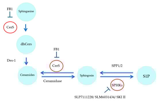 Sphingolipids are bioactive lipid molecules containing a sphingoid backbone attached to a fatty acid of variable chain length and composition, and they have gained remarkable attention in oncologic therapeutic approaches. The functional sphingolipid rheostat between ceramide and sphingosine 1-phosphate (S1P) has been well characterized in cancer therapy [], and sphingolipids are playing a central role in the pathophysiology of various tumors []. Especially in hepatic homeostasis, several studies observed an implication of (dihydro-) ceramides and S1P as major regulators of hepatocellular susceptibility to various stimuli [,] as well as of hepatocarcinogenesis both in vitro and in vivo [,,,,,]. Furthermore, modification of the sphingolipid pathway by the inhibition of regulating enzymes has been shown to play a significant role in the pathogenesis of tumors [,]. Particularly, previous observations have revealed an additive effect of the selective sphingosine kinase 2 (SPHK2) inhibitor ABC294640 together with sorafenib on cell toxicity and death in HCC cells in vitro and the increased suppression of tumor growth in murine HCC models []. In the same context and with adequate oral bioavailability, the dual sphingosine kinase inhibitor SKI II has been shown to act synergistically to fluorouracil in suppressing the proliferation and viability of HCC in vitro []. The exogenous addition of acid sphingomyelinase or ceramide has been shown to augment the anti-tumor efficacy of sorafenib [,]. Further data showed an upregulation of ceramide-induced cell death upon the stimulation of tumor cells with sorafenib and vorinostat [,] and a reversion of chemoresistance to sorafenib by the targeting of glucosylceramide synthase []. In addition, ceramide synthases inhibitor fumonisin B1 (FB1) has been linked with a regulatory role in HCC pathophysiology [,].