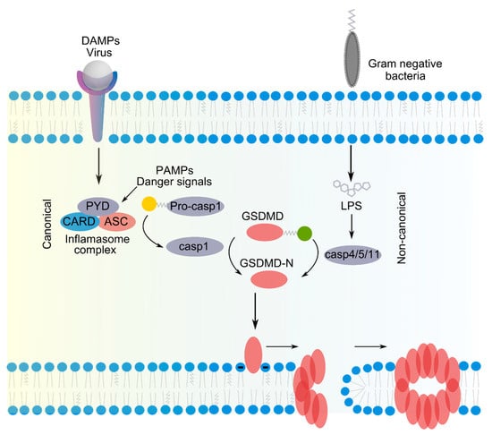 Pyroptosis is a highly inflammatory type of regulated cell death that is associated with the formation of membrane pores by GSDMs and often involves activation by inflammatory caspases 1 or 11 within the inflammasome complex [] (Figure 1). Two different inflammasome pathways, referred to as canonical or non-canonical, can lead to pyroptosis. In the canonical one, danger signals (e.g., pathogen- or damage-associated molecular patters (PAMPs and DAMPs)) are sensed by the inflammasome through pattern recognition receptors. After its activation within the inflammasome, caspase 1 mediates the cleavage and activation of GSDMD and of the inflammatory cytokines IL-1β and IL-18. In the non-canonical pathway, intracellular lipopolysaccharide (LPS) binds to caspase 4 and 5 (in human) and 11 (in mouse), resulting in their oligomerization and activation. These inflammatory caspases cleave a conserved site of GSDMD. In both the canonical and non-canonical pathways, the caspase-mediated proteolytic cleavage of GSDMD induces the dissociation of the N-terminal domain (GSDMD-N) from its auto-inhibitory C-domain. GSDMD-N has the ability to translocate to the inner leaflet of the plasma membrane, where it oligomerizes and induces the opening of membrane pores [,]. Besides GSDMD, other members of the GSDM family including GSDMA, GSDMB, GSDMC, and GSDME display pore-forming and pyroptotic activity upon the release of their N-terminal domain, although their mechanism of activation and the cellular settings under which they act are less clear [].