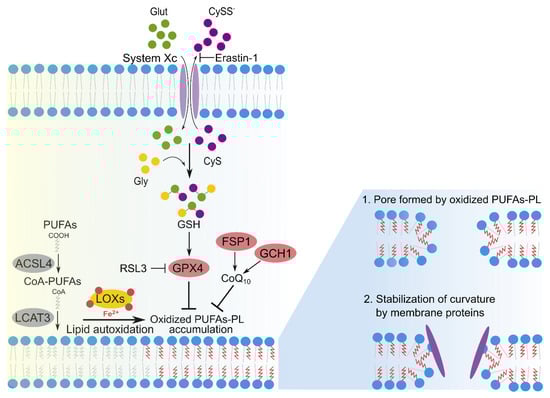 Ferroptosis is a caspase-independent form of regulated necrosis that involves the production of phospholipid peroxides in cellular membranes. Left: Loss of glutathione peroxidase 4 (GPX4) activity is the main trigger of ferroptosis. Ras-selective Lethal Small Molecule 3 (RSL3), which directly inhibits GPX4, and erastin-1, which affects the catalytic cycle of GPX4 by perturbing the levels of glutathione (GSH), both trigger ferroptosis. Ferroptosis suppressor protein 1 (FSP1) and GTP cyclohydrolase-1 (GCH1) that target ubiquinone in the plasma membrane can regulate accumulation of membrane oxidized PUFAs-phospholipids. Acyl-CoA synthetase long-chain family 4 (ACSL4) and lysophosphatidylcholine acyltransferase 3 (LPCAT3) mediate the incorporation of PUFAs into membrane. Lipoxigenases (LOX) catalyzes the incorporation of oxygen into the PUFAs, to produce lipid hydroperoxides, which are accumulated at the membrane in the absence of GPX4 activity. Right: Different models of plasma membrane permeabilization in ferroptosis: induction of membrane curvature by the accumulation of phospholipid hydroperoxides (1) (2) alteration of the function of membrane proteins and/or stabilization of membrane curvature by endogenous proteins.