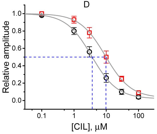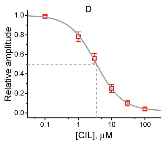 In good agreement with the findings of earlier studies [,,], the present observations disclosed that the presence of CIL was able to suppress the amplitude of hyperpolarization-elicited Ih, as well as to slow the rate of the current activation (Figure 1). There was a distinct hyperpolarizing shift in the midpoint of the activation curve of Ih in its presence with no alterations in the gating charge of the current (Figure 1). In this regard, the magnitude of its depressant action on Ih density in native cells could be strongly governed by factors, such as the CIL concentrations achieved, the pre-existing resting potential, the firing patterns of excitable cells, or a combination.