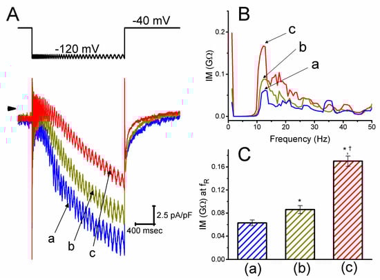 According to the impedance magnitude (IM) plot observed here (Figure 2) [,], as chirp voltage with the decreasing frequencies was applied to the cells, the resonance frequency (fR) with around 12.2 Hz was calculated. Cell exposure to CIL was noted to increase the IM value measured at the level of resonance frequency, although no discernible change in resonance frequency was detected. As described previously [,], the observed effects of CIL, therefore, led us to propose that changes in the sub-threshold oscillating current during Ih elicitation could be raised in the presence of CIL.