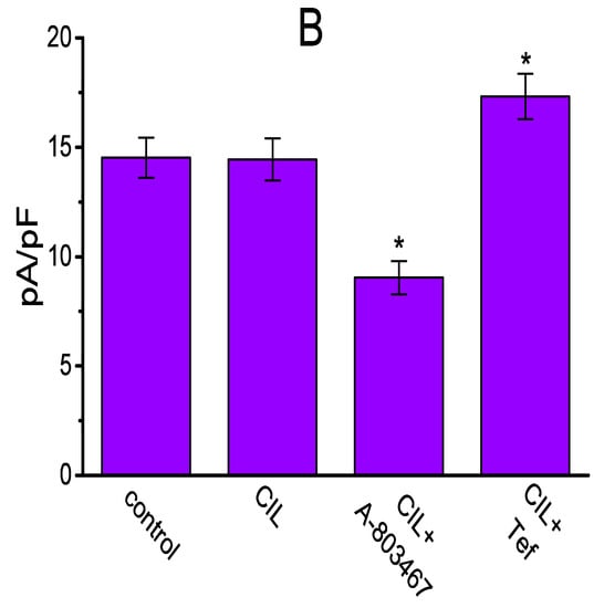 We further tested whether CIL was capable of modifying INa identified in GH3 cells. In these experiments, cells were suspended in Ca2+-free Tyrode’s solution, and the Cs+-containing solution was filled up in the recording pipette. As shown in Figure 8, as cells were exposed to 3 μM CIL, the peak density of INa in response to brief membrane depolarization was not altered. However, in the continued presence of 3 μM CIL, subsequent application of 3 μM A-803467 or 3 μM tefluthrin to the bath medium was able to suppress or enhance the peak INa density, respectively. A-803467 has been reported to be a selective blocker of NaV1.8 channels [], while tefluthrin, a pyrethroid, can activate INa []. Similarly, further addition of 1 μM tetrodotoxin, still in the presence of 3 μM CIL, was found to fully decreased peak INa density. In this regard, unlike the Ih or IK(DR), the INa inherently in these cells revealed no responsiveness to CIL.