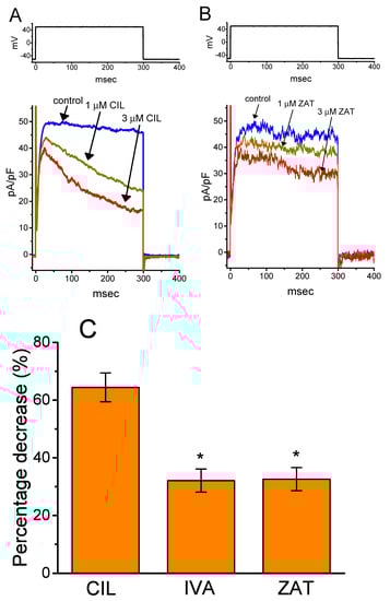 The results obtained also demonstrated that the shift in the midpoint of the inactivation curves of 1-s (Figure 5) or 10-s (Figure 7) conditioning potential-induced IK(DR) in response to CIL was concentration-dependent. In contrast, we failed to detect any changes in the gating charge of the current taken during exposure to different CIL concentrations. However, the response of the concentration of this effect occurred at the concentrations similar to those which suppress IK(DR) amplitude and elevate the inactivation time course of the current. In this scenario, distinct from the effects of zatebradine or ivabradine (Figure 9), the inhibitory action of CIL on IK(DR) could thus reflect its higher affinity bindings to KV-channel states, favored mainly at depolarized potentials, such as the open or inactivated state of the channel, although the detailed gating conformational changes of the channel in the presence of CIL need to be further characterized.