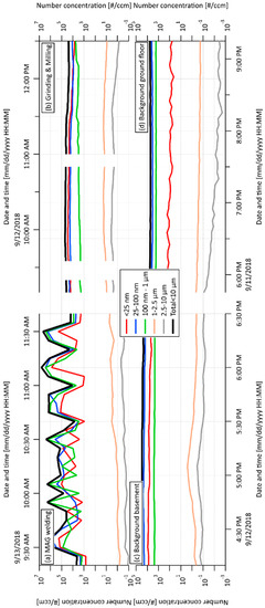 Exposure to five PM fractions (ranging from <25 nm to 10 µm) including two nano-fractions (<25 nm and 25–100 nm) was measured by on-line SMPA and APS monitoring (details in Section 4.2) in two workshops and two background spaces. Activities in workshop 1 included metal active gas (MAG) welding technology on mild steel S355J2 with wt % content: Fe (97.39%), Mn (1.7%), Si (0.6%), C (0.24%), P (0.035%) and S (0.035%). In workshop 2, machining (grinding and milling) of one type of sample containing epoxide resin with up to 20% SiO2 including nano-fraction as a filler was carried out. The first background space was located in the basement (same as workshop 1), the second one was located on the ground floor (same as workshop 2).